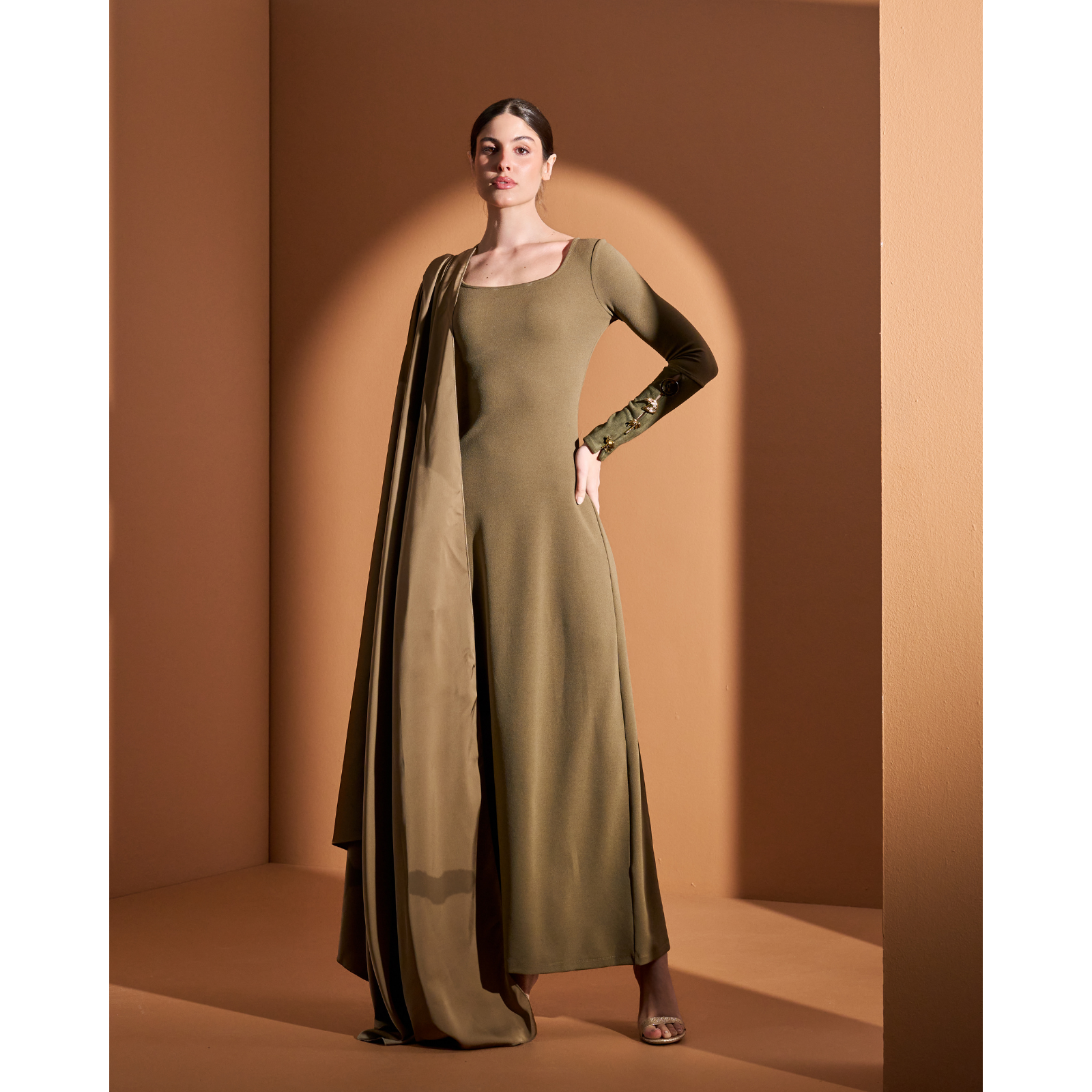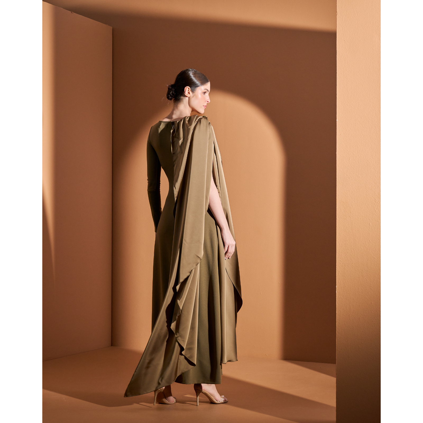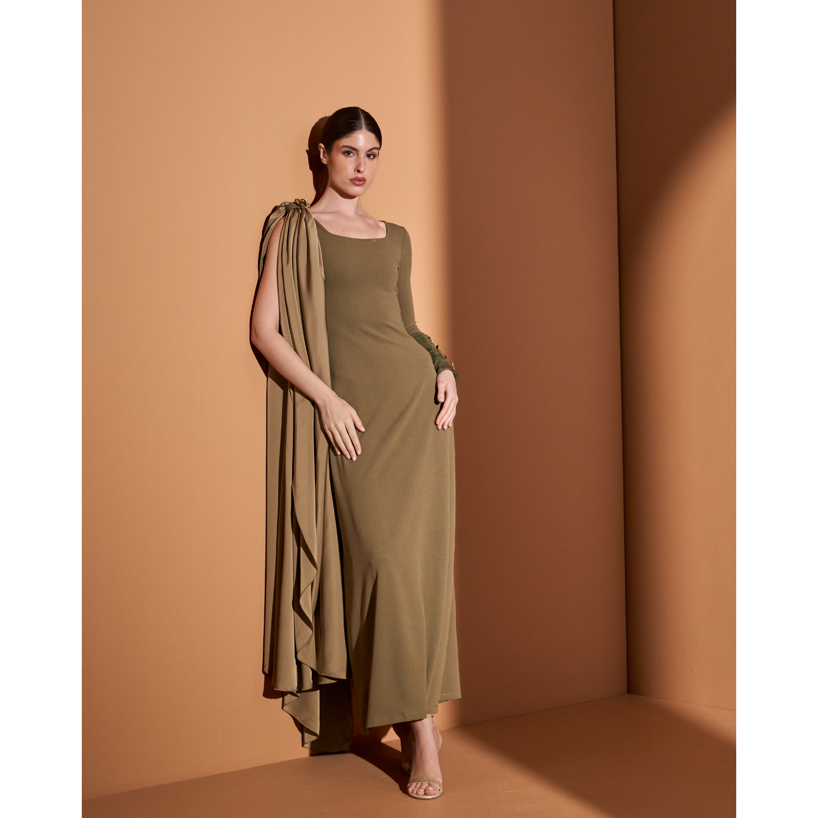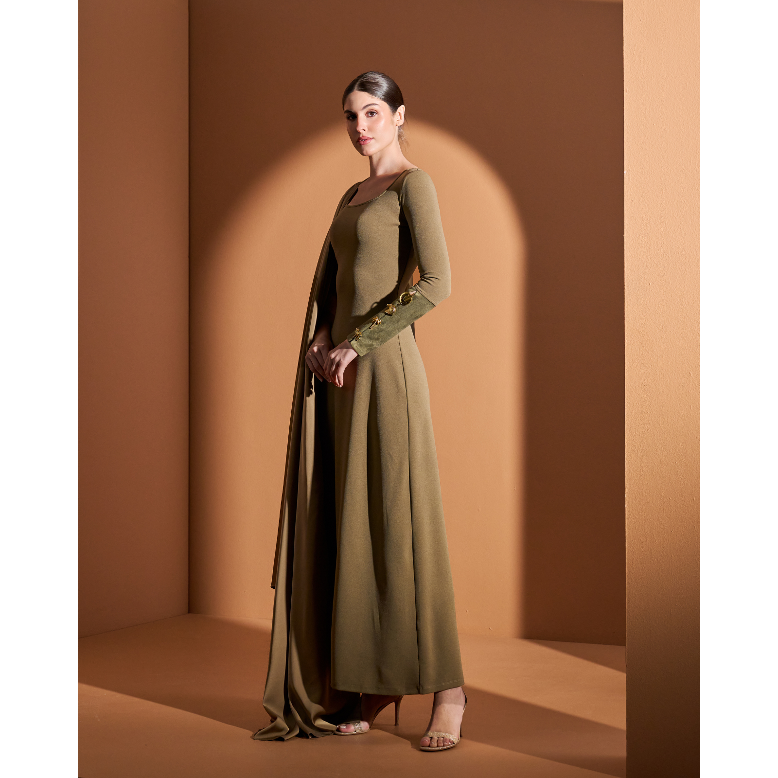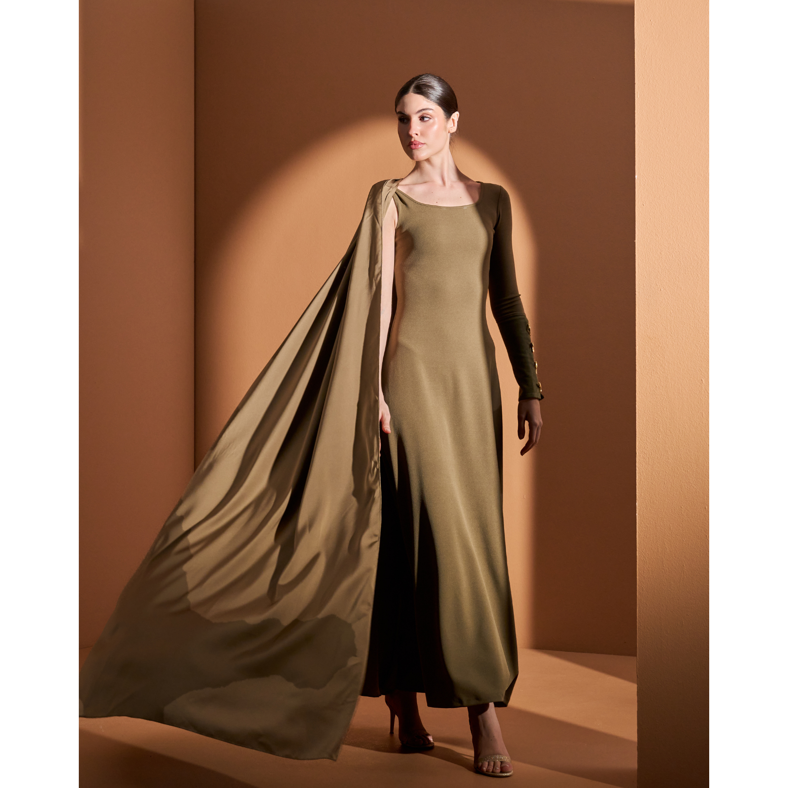 مصنوع من كريب زيتي ترابي يعكس هدوء وقوة واحة الصحراء بقصّة انسيابية متوازنة.