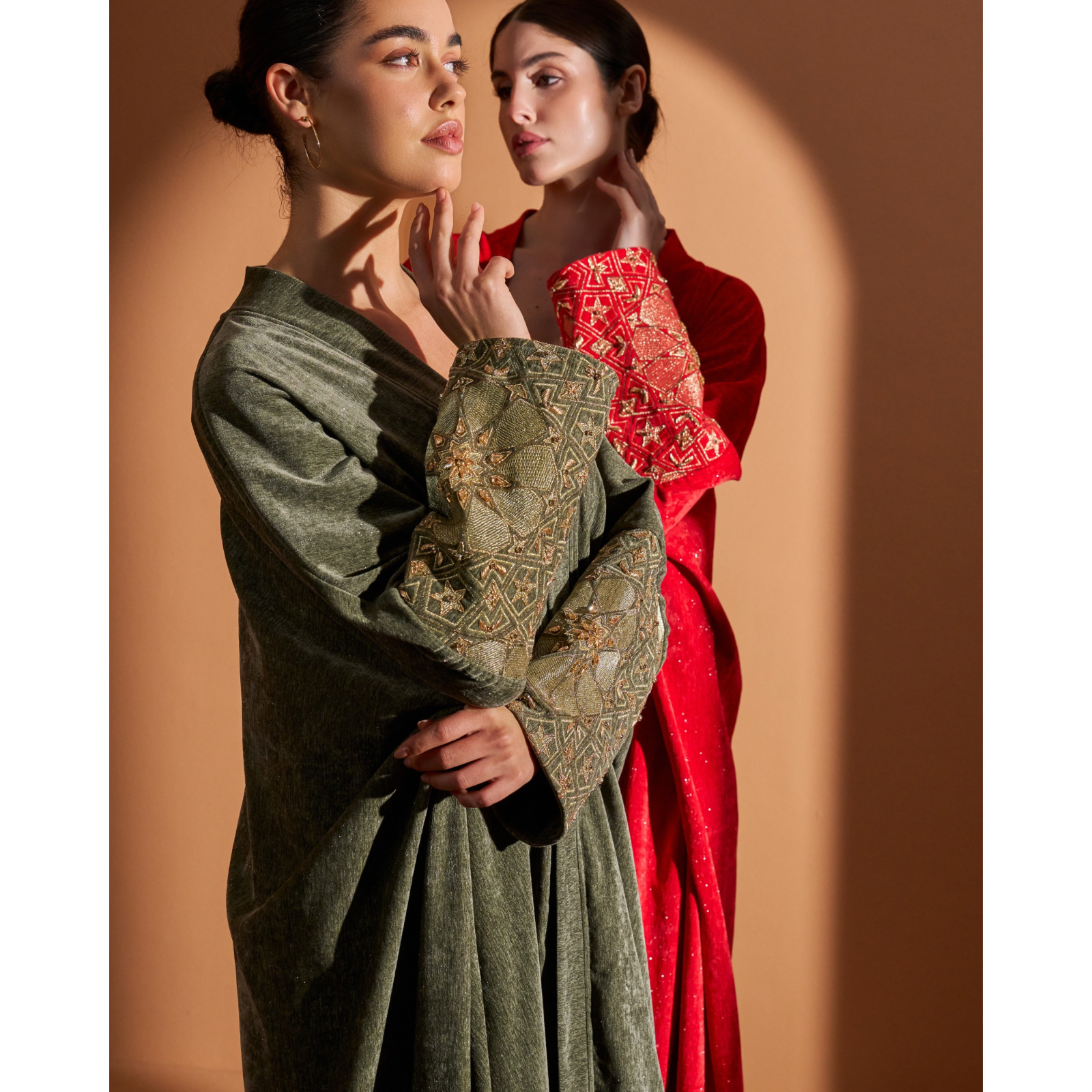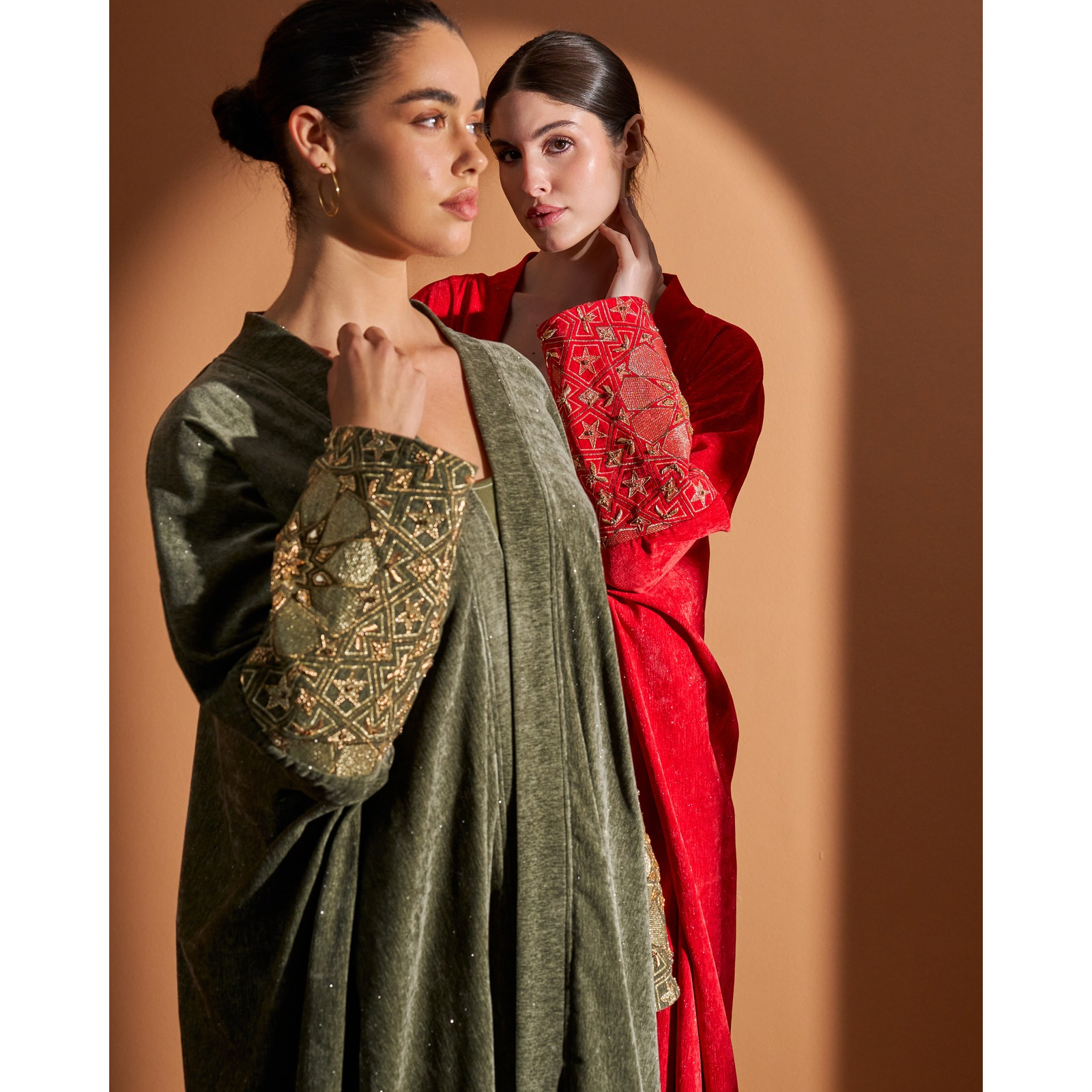The hand-embroidered sleeves are crafted over six hours, each motif patiently formed by hand. Inspired by arabesque and Islamic geometry, the embroidery draws from the largest mosque door in the world.