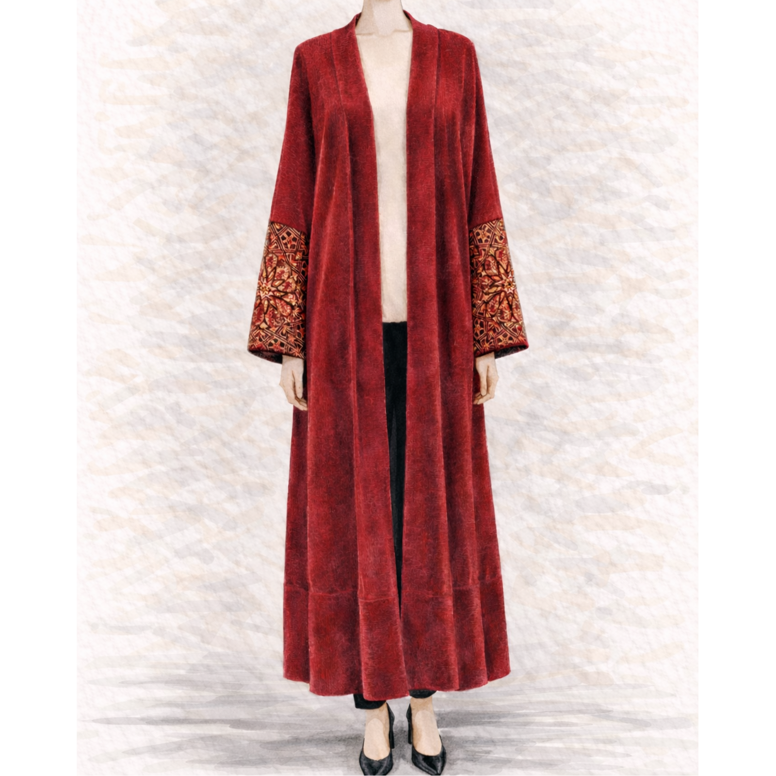 A velvet Bisht defined by time and tradition.